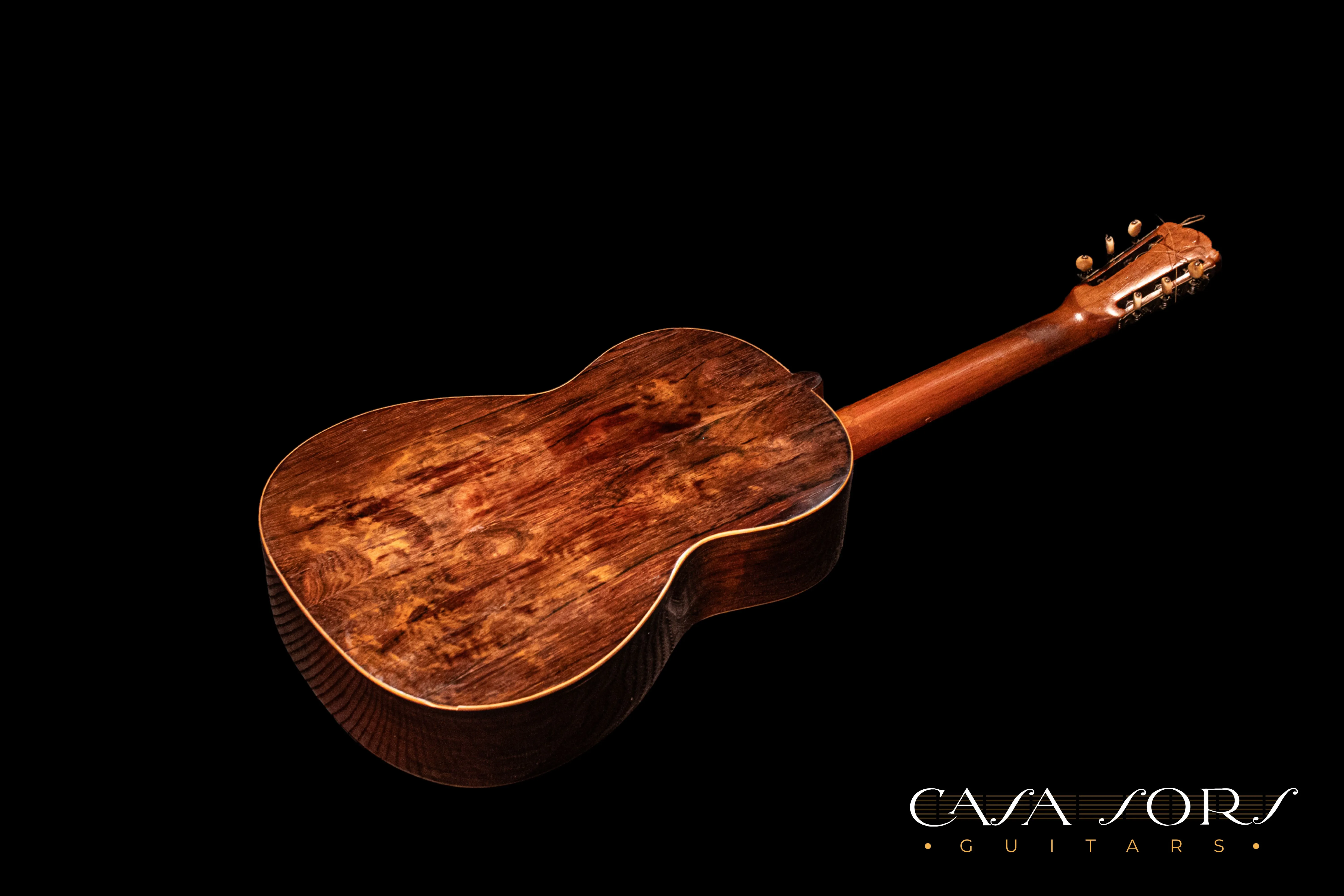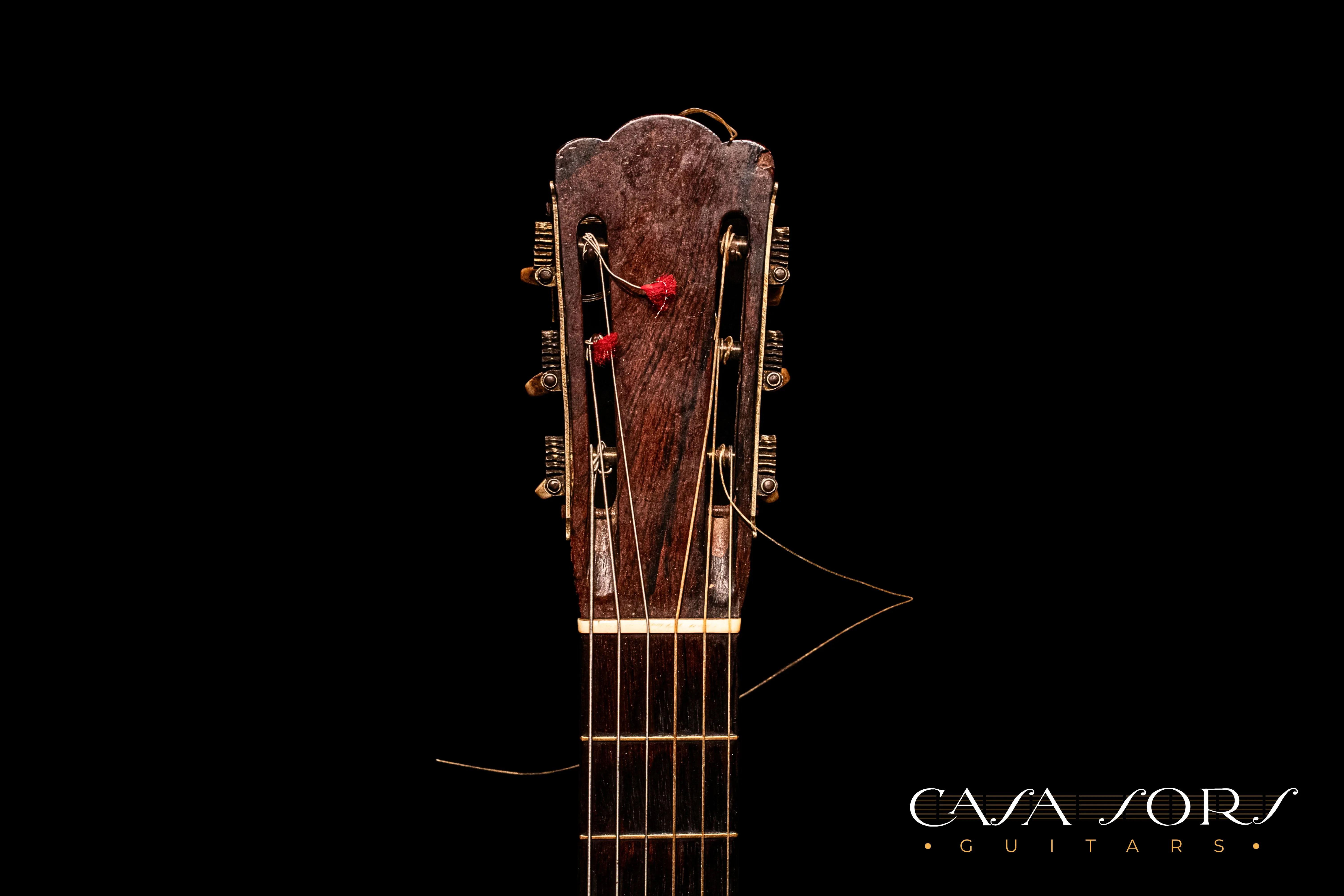 La guitarra posee algunas grietas en el fondo y la tapa que han sido encoladas cuidadosamente sin añadir refuerzos interiores, obteniendo como resultado un instrumento que conserva el eco y la respuesta original que a veces disminuye a causa de una reparación invasiva.